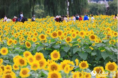 “更无柳絮因风起,惟有葵花向日倾。”近日,昆明市安宁市温泉街道金色螳川牧羊湖景区向日葵花开正艳,游人穿行在金黄的花海间,构成一幅人与自然和谐共处的唯美画卷。