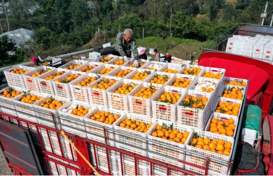 四川眉山市仁寿县板桥镇团园社区,果农们正在分拣晚熟柑橘。潘建勇摄(中经视觉)