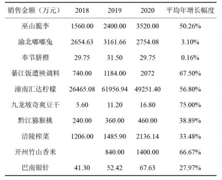 1.“巴味渝珍”农产品直报系统动态监测情况。根据精选的10家样本企业向农产品直报系统报送的数据分析,加入2018-2020年的批发价、零售价、批发销量和销售金额四个因素作为横向比对,剔除天气、市场波动等因素影响之后,发现这10家样本企业在加入“巴味渝珍”之后,批发价、批发量和销售金额均有相当幅度的增长,潼南汇达柠檬、九龙坡奇爽豆干、綦江饭遭殃调料、涪陵榨菜、黔江猕猴桃、巴南银针、巫山脆李销售量的平均年增长幅度分别为99.13%、75%、67.5%、21.5%、20%、11.84%和11.03%,特别是巫山脆李、汇达柠檬,相对于其他样本企业品牌口碑较弱的企业,在“巴味渝珍”的带动下,最终的销售金额出现了明显的增长。