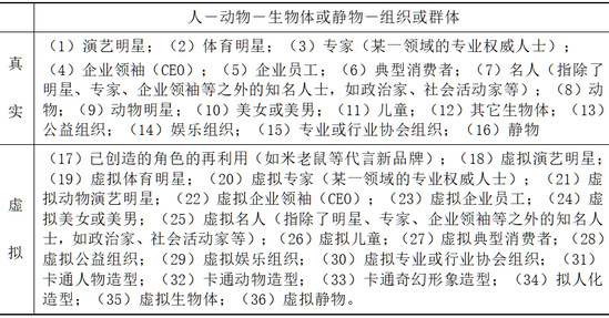 演艺明星指主要从事演艺事业,并获得了高知名度和注目率的演艺人员。体育明星指主要从事体育事业,并获得了高知名度和注目率的体育人员。专家指在某一领域中具有相关知识、并因此成为专业权威的专业人士。企业领袖(CEO)指的是某企业的领导人。名人指有相当知名度的知名人士,除了有相当知名度的明星、专家、企业领袖等之外,还有如政治家、社会活动家等人。(本课题中一般单指政治家、社会活动家等)。企业员工指的是某企业中的普通工作人员或一般的部门主管。典型消费者指的是某一产品或品牌的主要的、重要的消费者。美女或美男指具有美丽容貌等生理吸引力的男女。儿童泛指年龄未达少年期的幼小孩子。