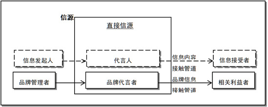 根据美国传播学者Gordon. L .Patzer的论点,在品牌代言传播过程及其体系中,品牌代言者的身份属于传播中介。终端信源——品牌经营管理者选择了采用品牌代言传播策略,使得品牌代言者成为传播中介。因此,品牌经营管理者是品牌代言传播过程及其体系中出现的代言者的信源,而品牌代言者又是传播接收者的信源。