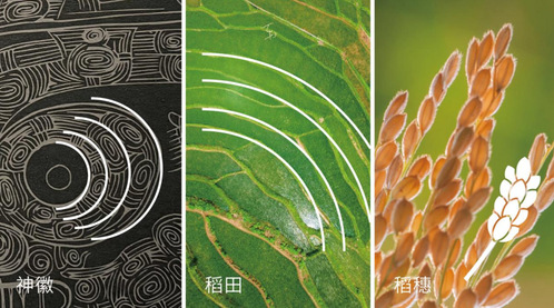 图14-3 良渚文明中的神徽线条与大米的稻田、稻穗元素联合利用
