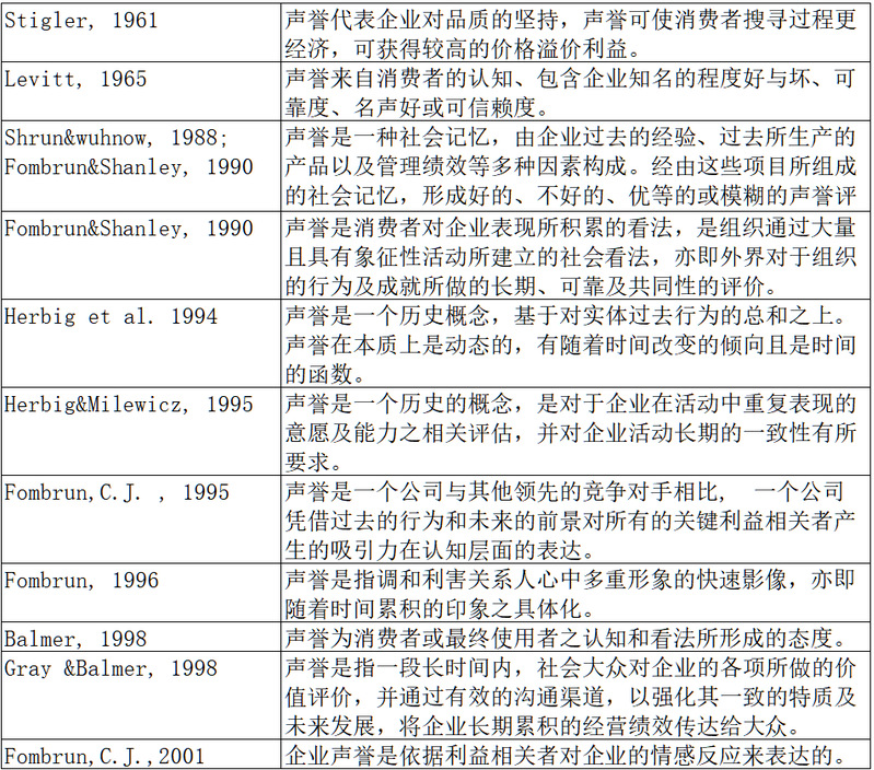 根据基于知网的相关文献研究,声誉概念,最早出自1961年的Stigler。他提出,声誉代表企业对品质的坚持,声誉可使消费者搜寻过程更经济,可获得较高的价格溢价利益。之后,有关声誉的定义陆续出现。