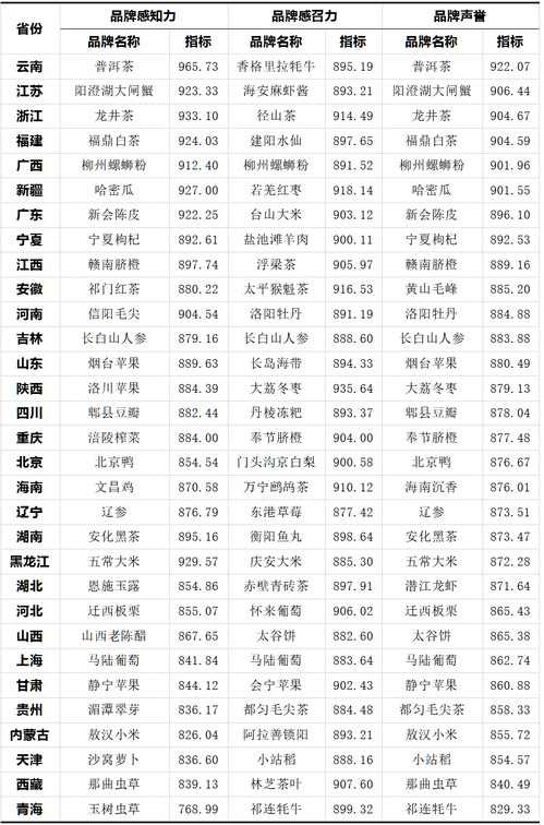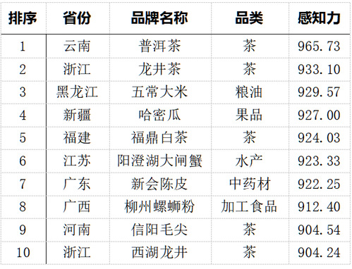 从各省市地标品牌的品牌感知力最高值比较,云南、浙江、黑龙江、新疆、福建、江苏、广东、广西和河南等9省地标品牌的品牌感知力最高值超过900。其中,来自普洱茶的品牌感知力高达965.73,其后依次分别为龙井茶(933.10)、五常大米(929.57)、哈密瓜(927.00)、福鼎白茶(924.03)、阳澄湖大闸蟹(923.33)、新会陈皮(922.25)、柳州螺蛳粉(912.40)和信阳毛尖(904.54);江西、湖南、宁夏等21个省份的地标品牌的品牌感知力最高值均位于820至900之间,品牌感知力最高值唯一低于800的省份是青海省,其品牌感知力最高值由玉树虫草(768.99)所获得。