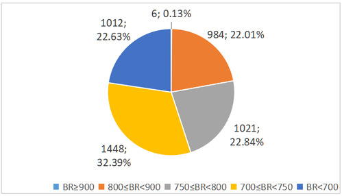 因本次获评地标品牌数量众多,课题组将指标分值从原有的百分制调整为千分制。获评的4471个中国地标品牌,平均品牌声誉为749.98,其中品牌声誉最高值达到了922.07。如图2所示,品牌声誉高于900的品牌数量仅6个;品牌声誉介于800至900之间的品牌共计984个,占本次获评地标品牌总量的22.01%;品牌声誉介于750至800的品牌共计1021个,占本次获评地标品牌总量的22.84%;2460个品牌的品牌声誉低于750,共计本次获评地标品牌总量的65.02%,其中品牌声誉不足700的品牌有1012个。可见,高品牌声誉的品牌极为稀少。