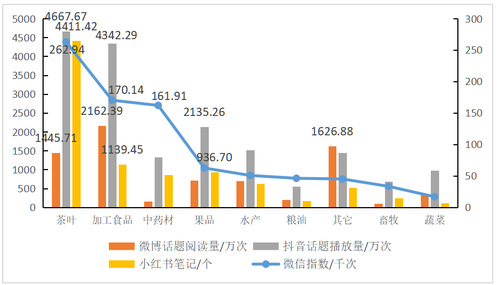 比较各品类地标品牌在4个新媒体平台上的平均活跃数据表现,包括微博话题阅读量、抖音话题播放量、小红书笔记和微信指数。图15-11所示,微博活跃度最高的前三类地标品牌是加工食品、其它和茶叶地标品牌,微博话题阅读量平均达到了2162.39万次、1626.88万次和1445.71万次;抖音和小红书活跃度最高的前三类地标品牌均是茶叶、加工食品和果品,抖音话题播放量平均为4667.67万次、4342.29万次和2135.26万次,平均小红书笔记数量分别为4411.42个、1139.45个和936.70个;微信活跃度最高的前三类地标品牌是茶叶、加工食品和中药材,微信指数年平均值分别为262.94千次、170.14千次和161.91千次。数据从一定程度上反映了,茶叶和加工食品地标品牌在典型新媒体平台上的活跃度较高。