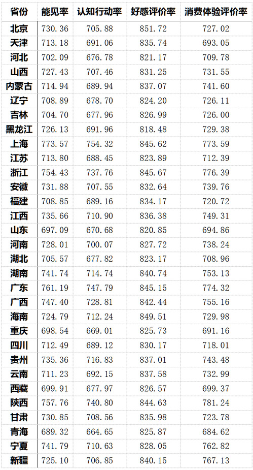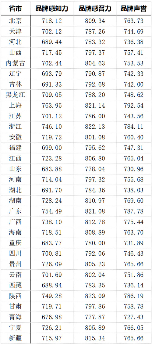 进一步比较各省市地标品牌在品牌声誉二级指标上的表现(表15-12),品牌能见率平均值达到获评地标品牌整体平均值(716.92)以上的省市共计17个,其中排在前5位的分别是上海(773.57)、广东(761.19)、陕西(757.76)、浙江(754.43)和广西(747.40);品牌认知行动率平均值在整体平均值(693.33)之上的省市共计16个,排在前5位的省市与品牌能见率排位相同、数值不同,上海(754.32)、广东(747.79)、陕西(740.80)、浙江(737.76)、广西(728.81),品牌能见率普遍高于品牌认知行动率;品牌好感评价率平均值在获评地标品牌整体平均值(830.90)之上的省市共计18个,其中北京(851.72)、海南(849.51)、浙江(845.67)、上海(845.62)和广东(845.15)位列前5位;品牌消费体验评价率平均值高于获评地标品牌整体平均水平(724.80)的省市共计20个, 陕西(781.24)、浙江(776.39)、广东(774.32)、上海(773.59)和新疆(767.13)位列前5位。以上可见,上海、广东和浙江三个省份的4项二级指标平均值均在前5位,整体表现出强劲的品牌声誉整合成效。