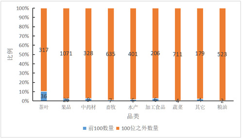 统计品牌声誉位于前100的地标品牌品类分布,如图15-6所示。茶叶地标品牌表现突出,共计36个品牌名列品牌声誉百强,是唯一一个获评百强与获评品牌总量占比超10%的品类;百强品牌数量位于第二位的品类是果品地标品牌,共计26个,但在获评果品地标品牌总量中的比例不高,仅为2.37%;中药材、加工食品和其它等3类地标品牌分别有9个、6个和4个品牌获得百强,均占各自品类获评地标品牌总量的2%至3%之间;畜牧、水产、蔬菜和粮油等4类地标品牌的百强品牌数量分别为7个、6个、4个和2个,品类获评品牌与百强比重均在2%以下。