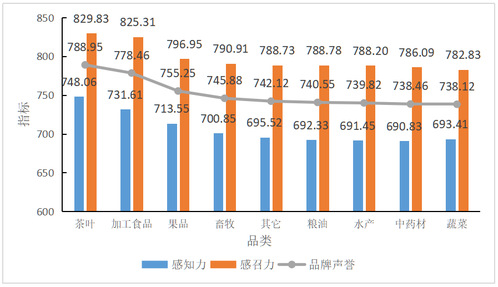 数据可见,中国地标品牌目前的品牌感知力整体处于中低水平,品牌感召力则相对较高,处于中上水平。茶叶地标品牌的各项指标表现较佳,也从一定程度上反映出,茶叶地标品牌更重视对品牌感知力、感召力的培养以及对品牌声誉的维护。