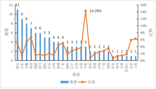 统计各省市地标品牌在品牌声誉前100位中的情况,本次获评地标品牌分属于32个省(直辖市、自治区),其中27个省份在百强地标品牌中占有一定席位。如图15-9所示,浙江、山东和安徽三省的地标品牌在前100位中占据的席位最多,分别为11个、9个和8个。宁夏回族自治区虽仅有3个百强地标品牌,但百强地标品牌的数量占其获评品牌总量的14.29%,是唯一一个百强地标品牌比例超过获评品牌总量10%的省份;上海和北京两市的百强地标品牌虽均仅为1个,但与获评品牌总量的比例与陕西省相当,高于其余省市。