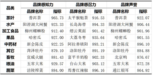 表15-9数据是本次获评的各类地标品牌的品牌声誉、品牌感知力和品牌感召力最高值的品牌。按品牌声誉最高值排序,依次为茶叶、水产、加工食品、果品、中药材、其它、畜牧、粮油和蔬菜。各类地标品牌声誉最高的品牌分别为普洱茶(922.07)、阳澄湖大闸蟹(906.44)、柳州螺蛳粉(901.96)、哈密瓜(901.55)、新会陈皮(896.10)、洛阳牡丹(884.88)、北京鸭(876.67)、五常大米(872.28)和通江银耳(864.92)。