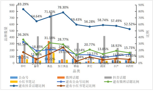 以上典型新媒体平台的相关数据反映出,茶叶、加工食品和果品三类地标品牌在新媒体平台上的活跃度相对较高,广东、广西、新疆、黑龙江和江西等5省份的地标品牌在典型新媒体平台上较为活跃。数据同时反映出,抖音平台是地标品牌的首要传播阵地,其活跃度较微信、微博和小红书平台高。在典型新媒体平台的活跃程度对于提高地标品牌在互联网环境下的品牌声誉具有一定的正向作用,尤其是在提高品牌能见率和品牌认知行动率上,具有积极作用,是地标品牌不可忽视的传播阵地。