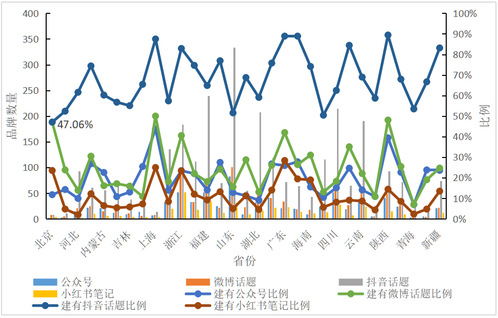 图15- 12 各省地标品牌在典型新媒体平台上的品牌数量和比例