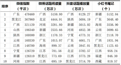 进一步比较各省市地标品牌在4个典型新媒体平台上的活跃程度,从表15-13统计可见,广东、广西、新疆、黑龙江和江西等5省在各典型新媒体平台的活跃度比较中露出4次,河南和云南露出3次,陕西、浙江、宁夏、北京和海南露出2次,另有山西、江苏、福建和西藏露出1次。数据显示,上述各省市的地标品牌在4个典型新媒体平台上的活跃程度较高。其中,各省市地标品牌的平均微信指数最高的三个省份分别是广东(478.46千次)、黑龙江(367.96千次)和广西(321.12千次),平均微博话题阅读量最高的是广西(5159.80万次)、北京(4444.91万次)和河南(3281.80万次),平均抖音话题播放量最高的是广西(8129.27万次)、陕西(5684.19万次)和新疆(5013.02万次),平均小红书笔记最多的三个省份则分别是新疆(5152.84个)、广东(3648.40个)和海南(3556.90个)。