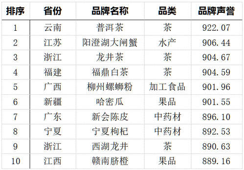 表15-2是本次评价中品牌声誉位于前10位的品牌。由表可见,茶叶地标品牌的品牌声誉表现强劲,在前10位中共占4席,分别为普洱茶、龙井茶、福鼎白茶和西湖龙井,其中,普洱茶以922.07的品牌声誉高居榜首,且与位列第2位的阳澄湖大闸蟹相比具有较大优势;果品和中药材地标品牌各占2席,分别为哈密瓜、赣南脐橙和新会陈皮、宁夏枸杞;水产和加工食品地标品牌均为1席,分别为阳澄湖大闸蟹和柳州螺蛳粉。