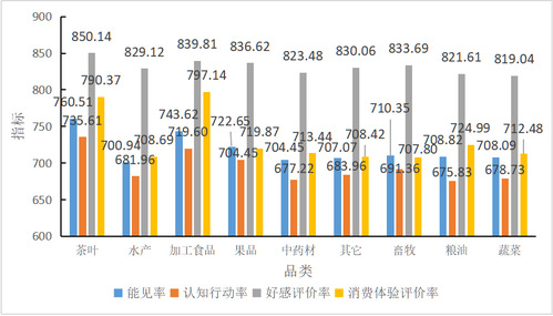 进一步比较各类地标品牌的平均品牌能见率、认知行动率、好感评价率和消费体验评价率,如图15-7所示,茶叶地标品牌分别以760.51、735.61和850.14的平均能见率、认知行动率和好感评价率,高于其余品类的平均值,该3项二级指标平均值位于第二位的品类均为加工食品类地标品牌(分别为743.62、719.60和839.81);而平均消费体验评价率最高的品类是加工食品类地标品牌(797.14),位于第二位的品类是茶叶(790.37)。可见,以普洱茶、龙井茶等为代表的茶叶和以柳州螺蛳粉为代表的加工食品类地标品牌,在品牌声誉各项指标上均有较为优秀的表现。数据也反映了茶叶和加工食品类地标品牌在互联网大数据环境下具有较系统化的呈现。
