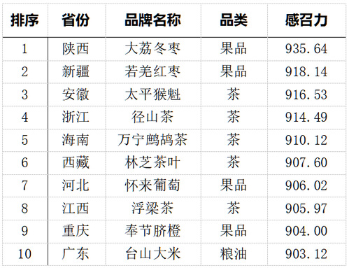 从各省市地标品牌的品牌感召力最高值比较,陕西、新疆、安徽、浙江、海南、西藏、河北、江西、重庆、广东、甘肃、北京和宁夏等13个省市地标品牌的品牌感召力最高值均在900以上,分别为大荔冬枣(935.64)、若羌红枣(918.14)、太平猴魁茶(916.53)、径山茶(914.49)、万宁鹧鸪茶(910.12)、林芝茶叶(907.60)、怀来葡萄(906.02)、浮梁茶(905.97)、奉节脐橙(904.00)、台山大米(903.12)、会宁苹果(902.43)、门头沟京白梨(900.58)和盐池滩羊肉(900.11);青海、湖南、湖北等18个省份地标品牌的品牌感召力最高值均在770至900之间。