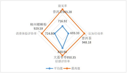 图15-4是本次评价4471个中国地标品牌在品牌能见率、认知行动率、好感评价率和消费体验评价率上的平均值和最高值比较。由图可见,从平均值比较,品牌好感评价率平均值为830.90,远高于其它3个二级指标;而认知行动率平均值仅为693.33,是唯一一个平均值不足700的指标。从最高值比较,品牌能见率最高值达到了983.28,品牌认知行动率最高值为948.18,该两项最高值均由普洱茶创造;品牌好感评价率最高值属大荔冬枣(950.35),品牌消费体验评价率最高值是柳州螺蛳粉(929.59)。