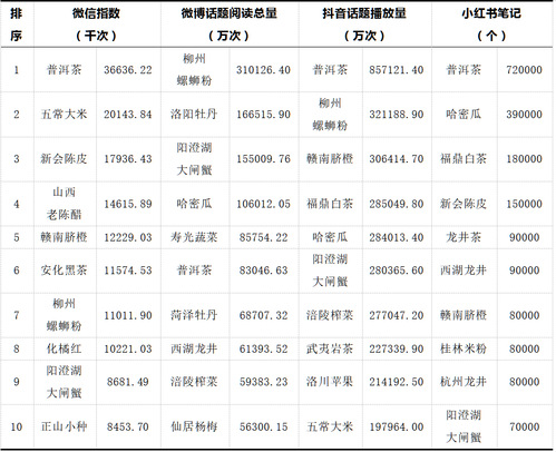 普洱茶和阳澄湖大闸蟹同时在4个新媒体平台的活跃度均较高,尤其是普洱茶,其微信指数、抖音话题播放量和小红书笔记均远远高于排在第二位的地标品牌;柳州螺蛳粉、赣南脐橙和哈密瓜3个地标品牌同时在3个新媒体平台呈现出较高的活跃度,其中柳州螺蛳粉在微博话题上的阅读量达到了31亿次;五常大米、西湖龙井、新会陈皮、福鼎白茶和涪陵榨菜同时在2个新媒体平台上呈现较高的活跃度。