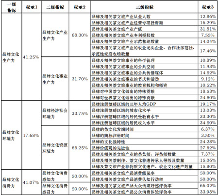 本课题采取层次分析法和德尔菲法的综合应用,来对“中国茶叶区域公用品牌文化力指数指标体系”进行权重赋予。根据上述品牌文化力构成的要素和指标体系,搭建不同指标维度的构架,通过专家打分和数学计算来确定各指标权重赋权,收集各品牌相关茶文旅的各项数据和信息后,依据权重计算出品牌对应的指数结果。此方法的指标权重相对固定稳定,便多年多次的延续性研究开展。