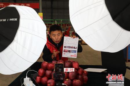 图为甘肃陇南市礼县,工作人员直播售卖苹果。(资料图)马宽 摄