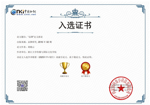 《“品牌”定义新论》从理论根基层面,革新对品牌概念的认知,重塑品牌研究框架,具有品牌研究的实践指导意义。中国知网系统对其的“引证评价报告”显示,“总体影响力:文献总被引频次为182,他引频次181,文献他引频次在‘企业经济’领域排名前1%,文献总下载频次为3644,在‘企业经济’领域排名前1%;长效影响力:近3年被引频次76,在‘企业经济’领域排名前1%;相对影响力:PDSI指数为12.040,在‘企业经济’领域排名前1%”。值得一提的是,此篇学术成果的五项影响力指数在7万多篇“企业经济”领域学术成果中排名前1%,并且在前1%中也处于前列,部分影响力指标排名近前1‰。