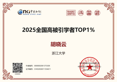 胡晓云主任入选“2025中国知网高被引学者 TOP1%”