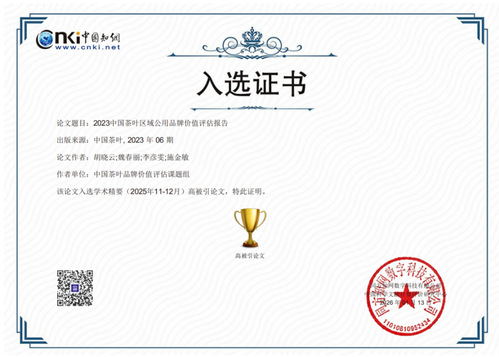 中国知网系统对《2023中国茶叶区域公用品牌价值评估报告》的“引证评价报告”显示,“总体影响力:文献总被引频次为52,他引频次50,文献他引频次在‘农业经济’领域排名前1%;长效影响力:近3年被引频次32,在‘农业经济’领域排名前1%”。《2024中国茶叶区域公用品牌价值评估报告》的“引证评价报告”显示,“总体影响力:文献总被引频次为35,他引频次34,文献他引频次在‘农业经济’领域排名前1%;相对影响力:PCSI指数为15.633,在‘农业经济’领域排名前1%;长效影响力:近3年被引频次35,在‘农业经济’领域排名前1%”。