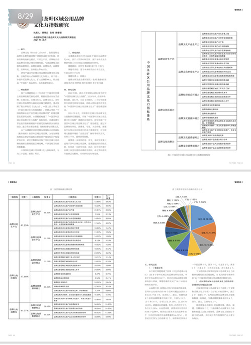 在2025年第5-6期的《中国茶叶》杂志;2025年第4期《茶博览》杂志上,分别发表了《中国茶叶区域公用品牌价值评估研究报告》《中国茶叶企业产品品牌价值评估研究报告》《中国茶叶区域公用品牌文化力指数研究》。品牌价值研究报告延续了之前16年的研究,进入了第17年度的公益课题研究,对推动中国茶品牌的价值提升提供理论模型、数据分析与价值提升的针对性建议。品牌文化力指数研究,突破了国内外的研究现状,创制了以“品牌文化生产力、品牌文化环境力、品牌文化消费力”为一级指标的“品牌文化力指数”理论模型,并通过数据分析、消费者自然言语的大数据采集与解析,对近百个中国茶叶区域公用品牌进行了文化力拥有现状、竞争状况、现存问题等分析,为中国茶叶区域公用品牌的品牌文化力提升,提供了理论指导与数据支持。