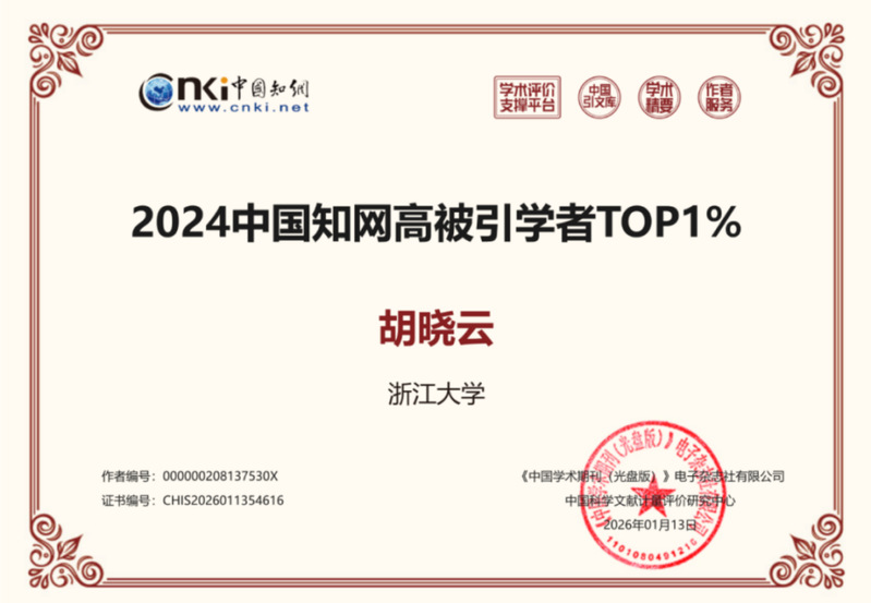 胡晓云主任入选“2025中国知网高被引学者 TOP1%”
