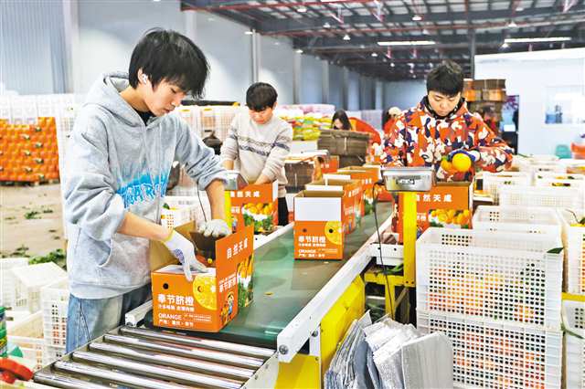 奉节县中国三峡柑橘交易中心,工作人员将挑选好的脐橙装箱。(摄于二○二五年十二月二十五日)记者 尹诗语 摄\视觉重庆欢迎大家来我们中国三峡柑橘(奉节脐橙)交易中心参...