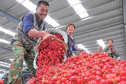 临朐县山旺大樱桃市场樱桃户正交易樱桃。资料图初秋时节,来到山东省潍坊市临朐县城关街道的大樱桃现代农业科技示范园,园区运营方、博后农业科技有限公司经理刘金斌自豪地...