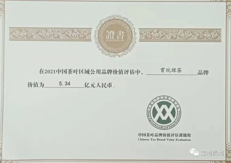 近日,在农业品牌研究院最新公布的2021中国茶叶区域公用品牌价值评估报告中,贵池区霄坑绿茶区域公用品牌价值评估5.34亿元,位居全国96位。单位销量品牌收益3817.84万元,...