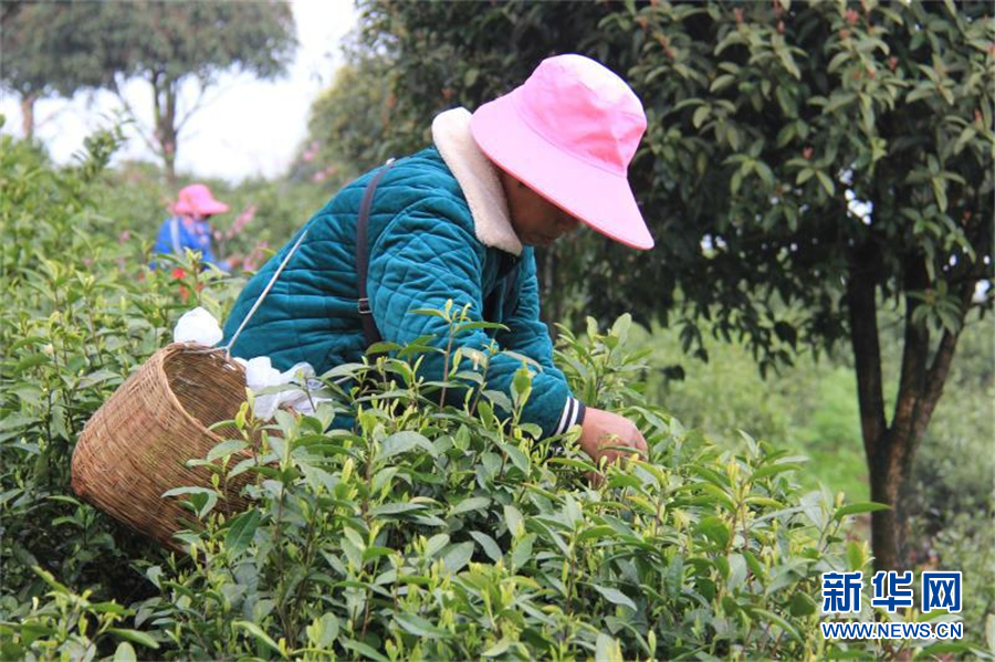 图为恩施洞下槽村村民采摘春茶。 刚卖了62斤鲜叶,领到
