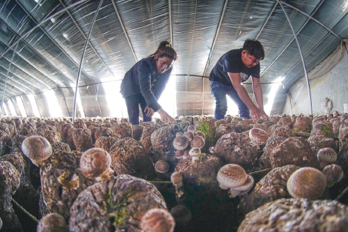 遵化市汤泉满族乡关山口村农民在大棚内管理种植的香菇。 刘