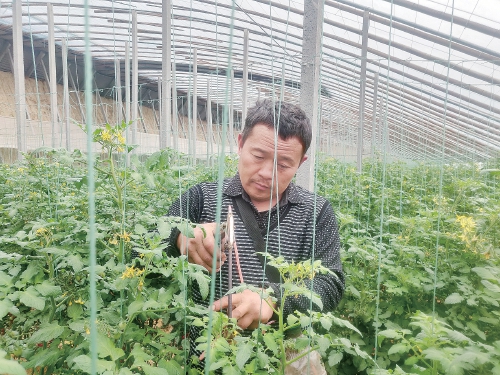 明村镇农民在给西红柿授粉。 资料图 “眼下又到樱桃西红